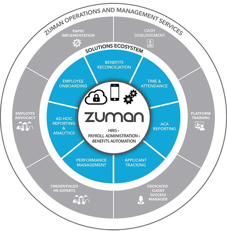 The core of the HR BPaaS solution is managed by a SOLUTIONS ECOSYSTEM containing ACA reporting, benefits reconciliation, time & attendance, performance management, reporting, learning management and a cash disbursement solution.